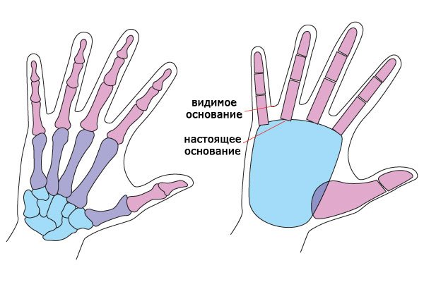 Tuleb märkida, et sõrmede vaheline tegelik alumine joon - sõrmenukkide külge kinnituv liiges - on palju madalam kui seda kattev nahavolt. See on väga oluline punkt, mille juurde me veel tagasi pöördume.