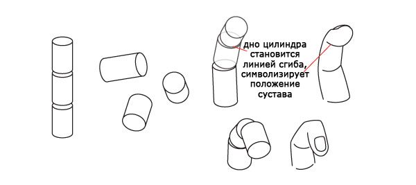 Kui teil on raskusi konkreetselt sõrmede joonistamisega, kujutage neid silindritena ette. See lihtne kuju aitab teil joonistada sõrmi iga nurga all. Vaadake joonist: silindrite servadest saavad voldijooned, punktid, kus asuvad liigendid.