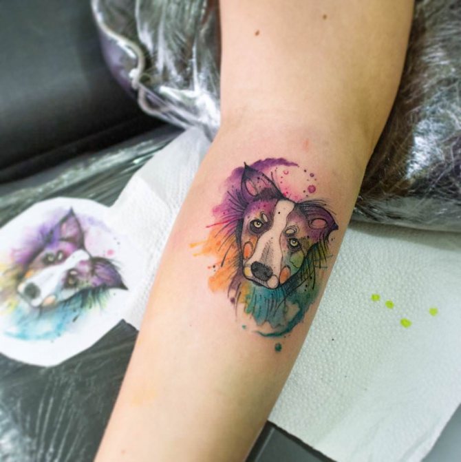 Nagu pildilt näha, kujunevad akvarellitatoveeringud intensiivseks. Kõige populaarsemateks kujunditeks peetakse hunte ja rebaseid. Joonistused on kantud karikatuurses, peaaegu lapselikus stiilis. Neis ei ole agressiooni ega viha. See tehnika sobib mis tahes eluslooduse maalimiseks. Müütilise olendiga, näiteks draakon või ükssarvik, tätoveering näeb originaalne välja.
