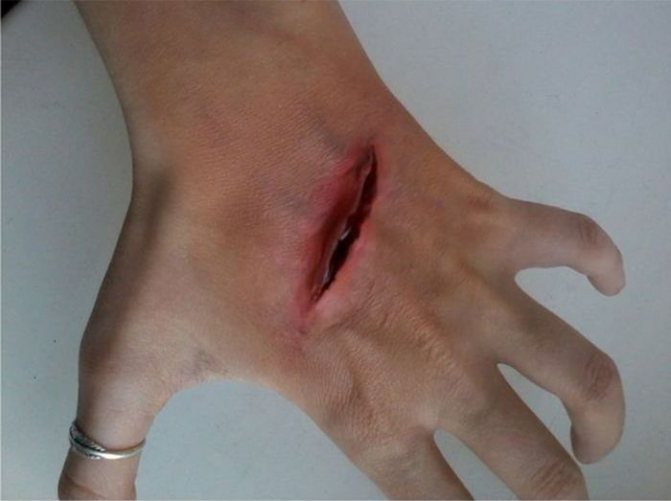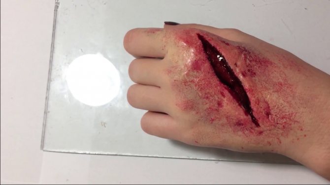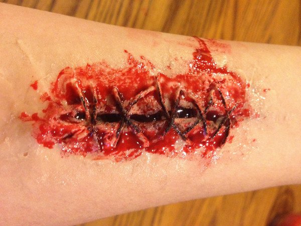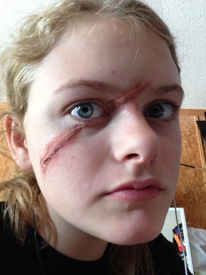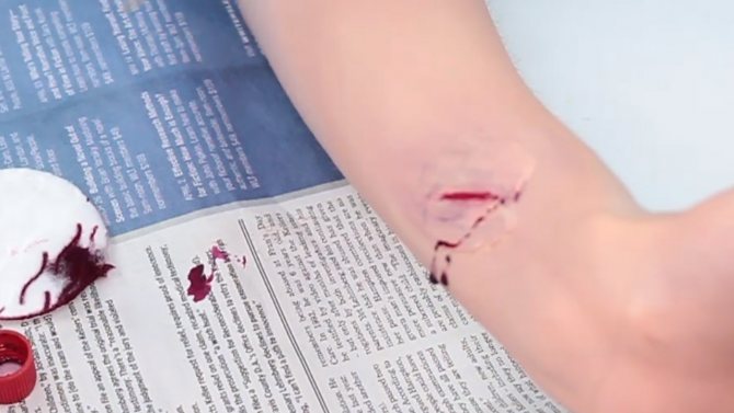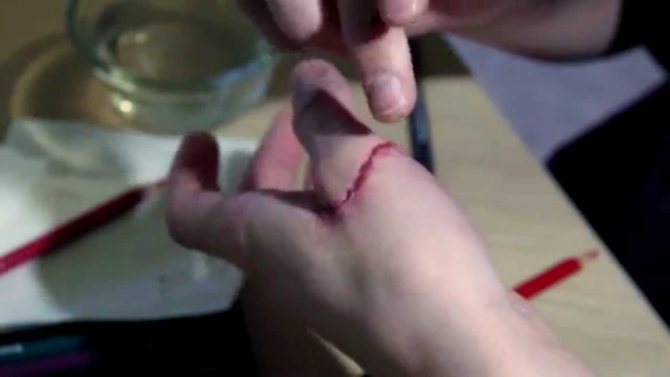 Lõike tegemiseks kasutatakse käärid. Et haava muutuks realistlikumaks, nagu on näidatud samm-sammult fotol, võite seda Halloweeni ajal sõrmedega üle lihvida.