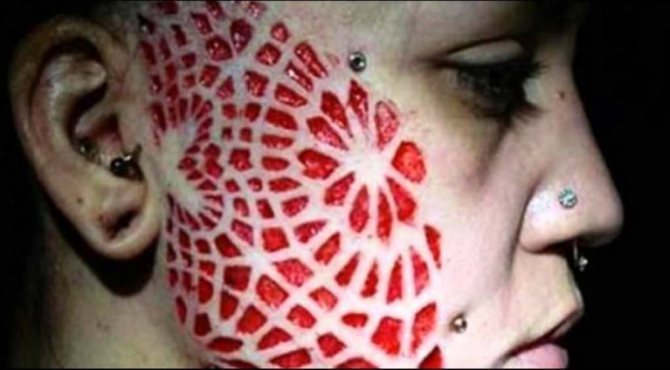 - Kandke märgistus nahale või kandke kergesti loetava ja lihtsa mustriga šabloon. Seejärel lõigake ettevaatlikult skalpelliga osa nahast välja, lõigates ja tõstes seda, jättes seega kehaosa vabaks. Kasutades steriilseid lappe, pühkige avatud alad ettevaatlikult ära. Pärast seda paranevad paljastatud nahapiirkonnad ja muutuvad ilusaks armiks, mis sarnaneb oma kontuuridelt teie lemmikmustrile.