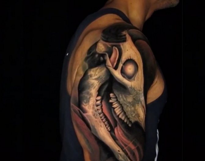 Osa tätoveeringust on kilpkonnakoor, mis on kujutatud traditsioonilises polüneesia stiilis. See on väga tugev amulett negatiivse energia ja probleemide vastu. Ja suur silm, mis on samuti osa kompositsioonist, aitab näitlejal vaenlasi võita ja vaenlasi lepitada. Tätoveeringus on ka väike silm, mis tuletab filminäitlejale meelde, et tema esivanemad valvavad ja kaitsevad teda alati.