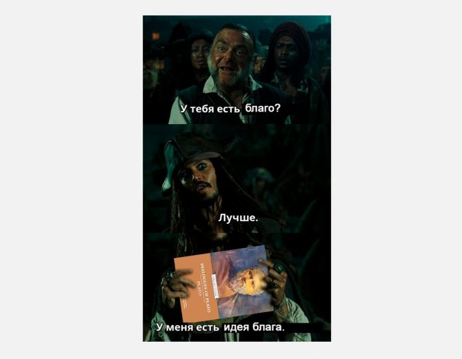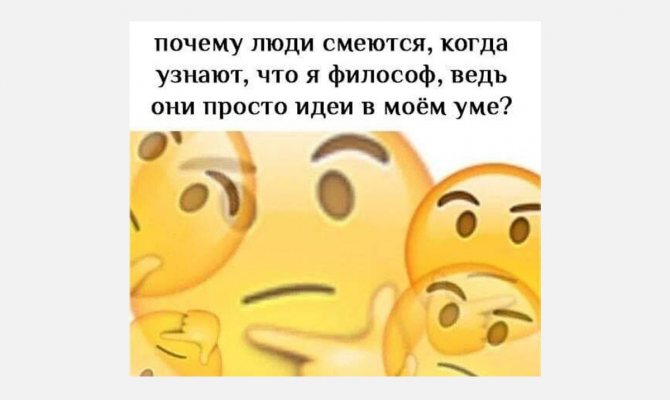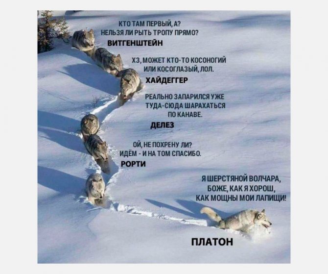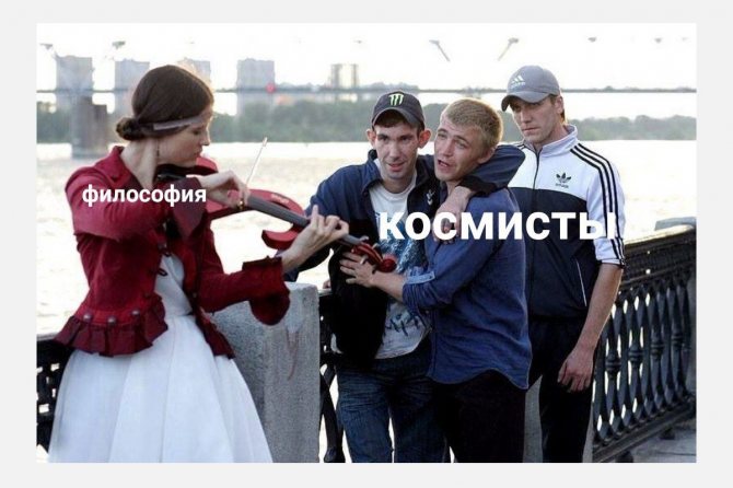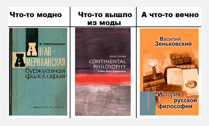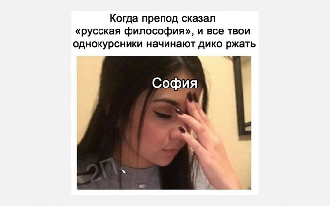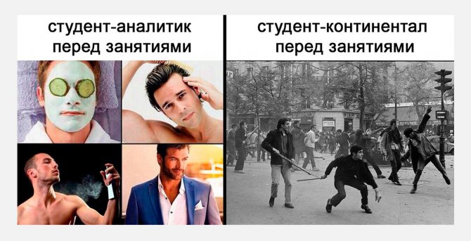 Nykymaailmassa kilpailee kaksi filosofista suuntausta - analyyttinen, joka nojaa filosofisten ongelmien ratkaisemisessa kielen loogiseen ja kielelliseen analyysiin, ja mannermainen, joka nojaa enemmän kokemuksen analyysiin. Venäläinen filosofia erottuu edukseen. Yksi Venäjän ajattelun tunnetuimmista tutkijoista, Vasili Zenkovski (1881-1962), piti sitä omaperäisenä ja omaleimaisena perinteenä. Tämä meemi ironisoi suuren osan nuoremman ajattelijasukupolven skeptisyyttä venäläistä filosofiaa kohtaan.