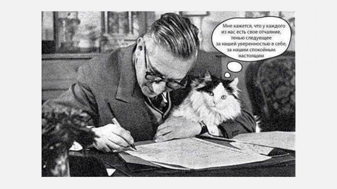 Ateistisen eksistentialismin edustaja Jean-Paul Sartre antoi kissalleen nimen Ei mitään. Tässä Ei mitään katsoo meitä kuin Sartre omistaisi sen ja kirjoittaisi ajatuksensa paperille.