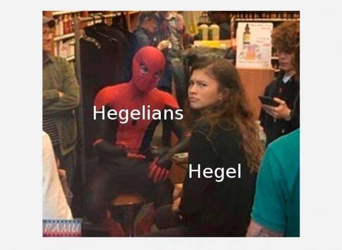 Spider-Man: Far From Home -elokuvan kuvauksista otetussa otoksessa MJ:n roolia näyttelevä Zendaya näyttää olevan vaivautunut pääosanesittäjän tungettelevista selityksistä. Hegelillä olisi saattanut olla samat kasvot, jos hän olisi kuullut omien seuraajiensa, hegeliläisten, selityksen filosofiastaan. Heidän mielestään Hegelin ajatuksista on tullut jotain hyvin kaukana hänestä itsestään olevaa, joskus jopa vihamielistä ja materialistista, kuten esimerkiksi Feuerbachin tai Marxin kohdalla.