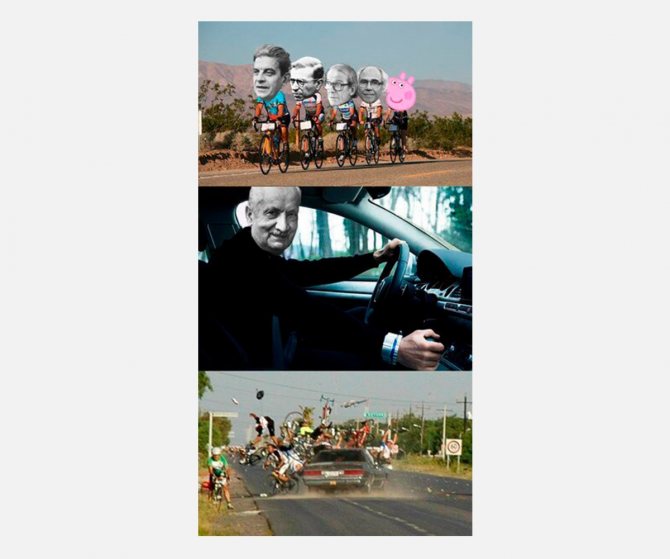 1900-luvun kuuluisat postmodernistit (ylhäällä vasemmalta oikealle: Lacan, Sartre, Deleuze, Baudrillard) ja Peppa-possu ajavat polkupyörillä tiellä ja ovat aikeissa tukkia 1900-luvun tärkeimmän saksalaisen filosofin Heideggerin ja yleensä saksalaisen ajattelun tien. Heidegger pyrki filosofisessa projektissaan määrittelemään uudelleen kysymyksen filosofian roolista maailmassa. Tällaiset asiat ovat aina vaikeita ja niihin liittyy eräänlaista väkivaltaa. Hänelle ei siis jää muuta vaihtoehtoa kuin törmätä filosofiaan täysillä.