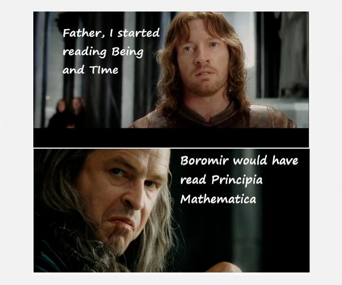 "The Principles of Mathematics" on englantilaisten Russellin ja Whiteheadin tinkimätön teos matematiikan logiikasta ja filosofiasta. Vain todelliset urheat miehet pystyvät hallitsemaan nämä kolme volyymia, ja näin Gondorin varakuningas Denethor II näkee poikansa Boromirin Taru sormusten herrasta -elokuvassa. Hänen nuorin poikansa Faramir on valinnut väärän tutkielman tehdäkseen vaikutuksen isäänsä, sillä saksalaisen filosofin Heideggerin teokset, jotka ovat suosittuja epämuodikkaiden nuorten keskuudessa, erityisesti "Olemassaolo ja aika", eivät selvästikään ole sitä, mitä todellisen Gondorin pojan pitäisi tehdä. Selkeän ja loogisen analyyttisen filosofian ("Principles") ja epämääräisen, sekavan mannermaisen filosofian ("Being and Time") välillä on klassinen vastakkainasettelu.