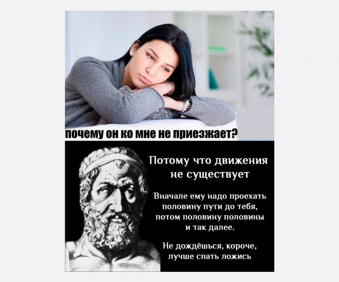 Muinaiskreikkalaisen retoriikan tärkeimpiä mestareita ovat Aristofanes, Sokrates, Diogenes ja Zenon, jotka on esitetty tässä kuvassa. Jälkimmäinen kritisoi erittäin tyylikkäästi matemaattisten abstraktioiden sovellettavuutta todellisuuteen tehtävissä-paradoksissaan - niin sanotuissa aporioissa. Yksi kuuluisimmista, Akilleksesta ja kilpikonnasta kertovista, on se, että Akilles ei koskaan saa kilpikonnaa kiinni, koska jokaisella askeleella kilpikonna laittaa käpälänsä yhden senttimetrin edelle.