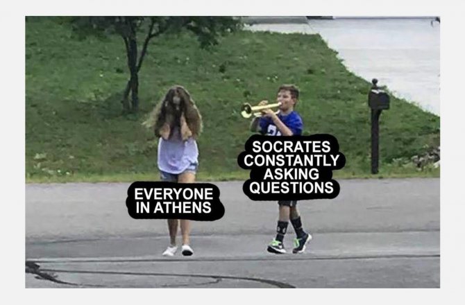 Vasemmalla merkintä: "Kaikki Ateenassa". Oikealla: "Sokrates esittää jatkuvasti kysymyksiä".