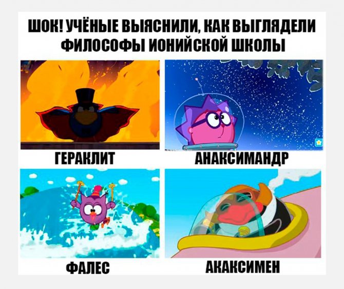 Jos olet tarkkaavainen, voit tunnistaa antiikin kreikkalaiset Joonian koulukunnan filosofit myös "Smesharikin" hahmoissa. Joonianmeren koulu - Antiikin kreikkalaisen filosofian spontaani materialistinen haara, joka yhdisti filosofeja, jotka asuivat ja opettivat Joonianmeren rannikolla sijaitsevissa kaupungeissa.... Herakleitos, Anaksimander, Thales ja Anaksimenes etsivät myös maailman ensisijaista perustaa ja löysivät sen eri aineista: Herakleitos näkee maailmamme perustana tulen, Thales veden, Anaksimander apeironin, jotakin muodotonta ja salaperäistä muiden alkuaineiden yhtymäkohdassa, kun taas hänen oppilaansa Anaksimenes korvaa apeironin yksinkertaisesti ilmalla, koska se on niin kätevää ja kaikkien ymmärtämää.