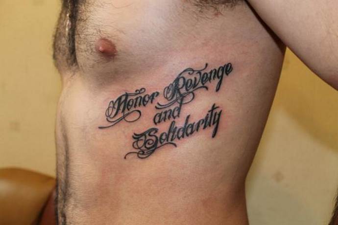 Tatuoinnit kylkiluissa (miesten piirustukset ja merkinnät ovat yleensä hienostuneita ja niissä on raakoja yksityiskohtia - ketjuja, pääkalloja ja niin edelleen), jotka on kirjoitettu espanjaksi, voivat edustaa lauseita: