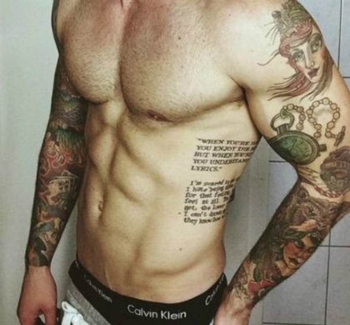 Tatuoinnit kylkiluihin (alastonkuvien miespuoliset variantit - merkinnät suositellaan kirjoitettavaksi suurella goottilaisella kirjoitusasulla), jotka on kirjoitettu latinaksi, voivat edustaa lauseita: