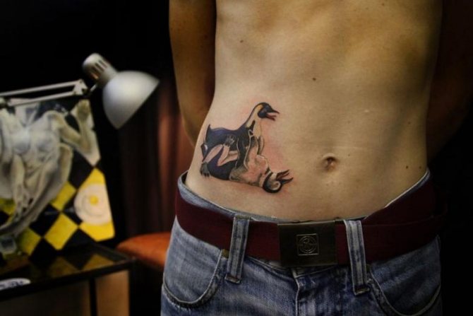 Pääsääntöisesti tatuoinnit, jotka sijaitsevat nivusissa, Eivät sisällä mitään merkitystäItse asiassa niitä ei ole tarkoitettu yleiseen tarkasteluun. Useimmiten kuva rakennetaan Anatomisen muodon jäljittely miehen sukupuolielimen. Esimerkiksi tatuoinnit muodossa Pinokkio, norsu, käärme...