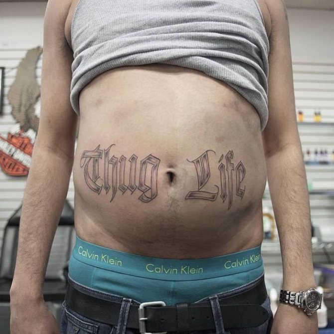 Vatsan alueella on monia chicano-tyylisiä tatuointeja. Tytön kuva, joka on toteutettu mustin ja harmain sävyin ja jota täydentää tausta, joka kulkee sivuille, tai merkinnät näyttävät vaikuttavilta tässä paikassa.