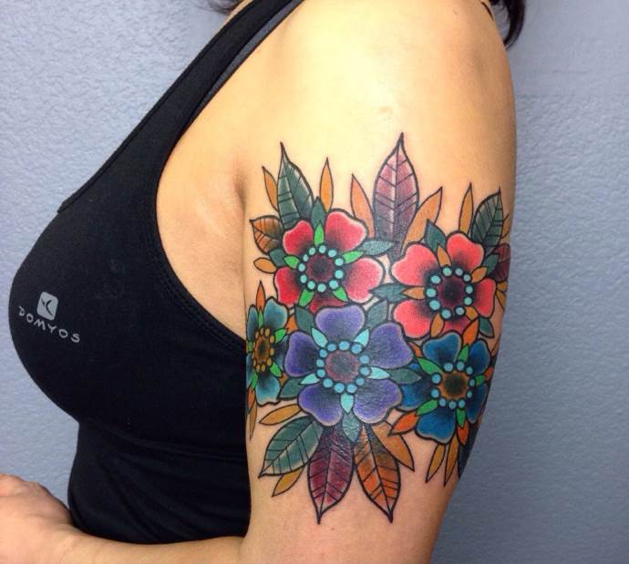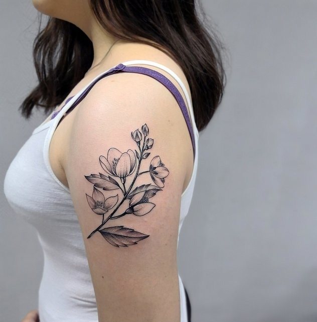 Kukkamallit tytön olkapäässä näyttävät hyvin naisellisilta ja hienostuneilta. Yleisimmät kuvat: ruusu, lootuskukka, lilja, orkidea, sakura. Kunkin kukan lisäksi myös kuvan väri on tärkeä. Valkoiset nuput yhdistetään puhtauteen ja viattomuuteen, punaiset rakkauteen ja intohimoon, vaaleanpunaiset henkisyyteen ja violetit suruun ja viisauteen.