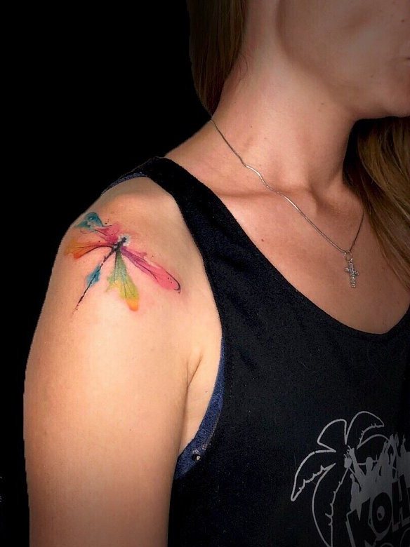 Naisten olkapäillä jopa laajat kirkkaat tatuoinnit näyttävät todella kauniilta ja hienostuneilta. Tässä tapauksessa mauttomuus ei tule kysymykseen. Muuten, juuri tästä syystä varttuneemmat naiset käyttävät mieluummin pysyviä koruja olkapään alueella.