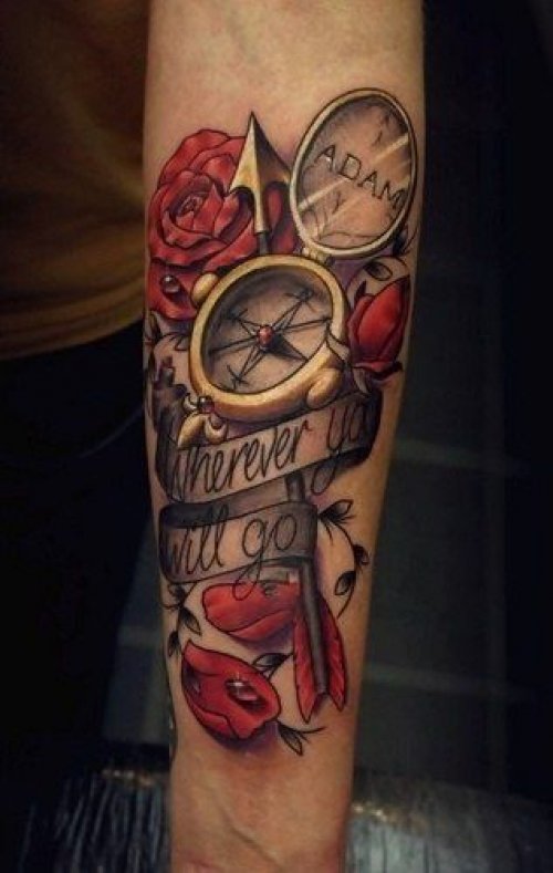 Tatuointi tuuliruususta käsivarteen, olkapäihin ja muihin kehon osiin.