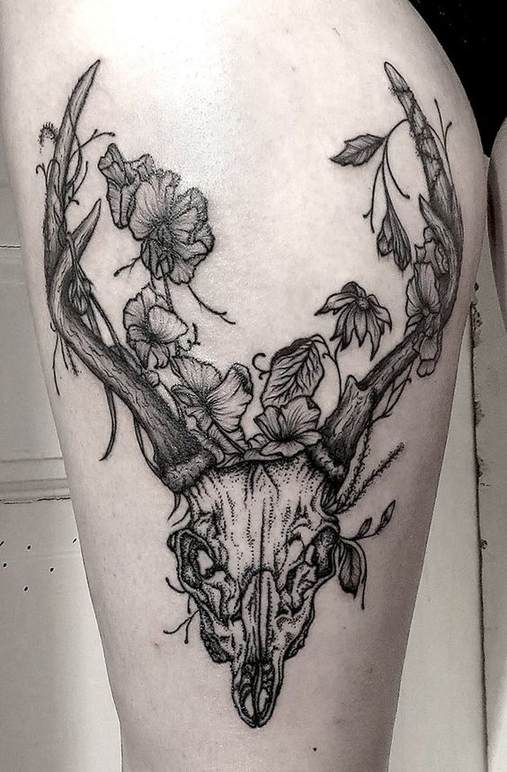Kallon tatuointi kukkien kanssa