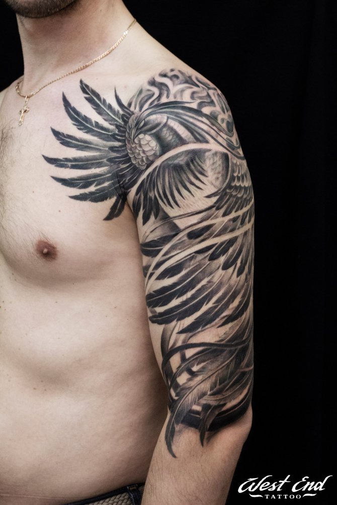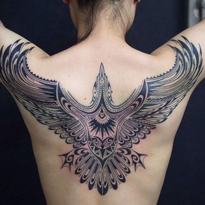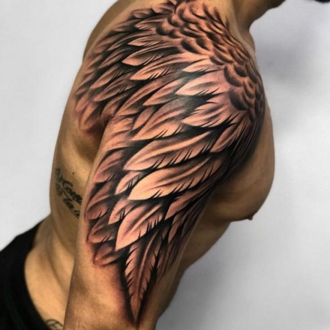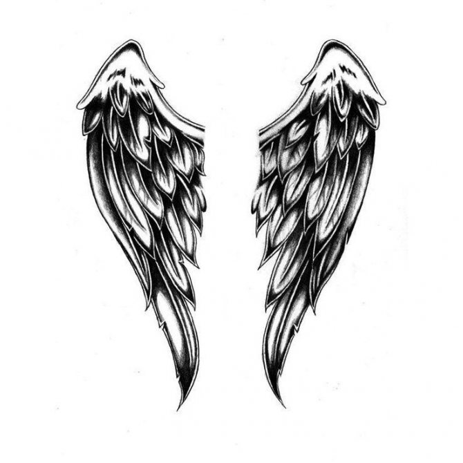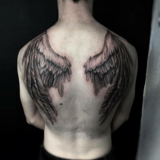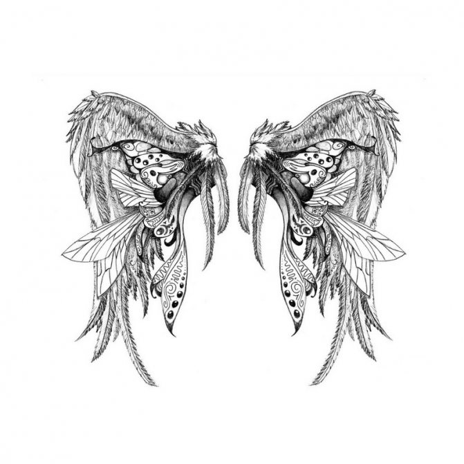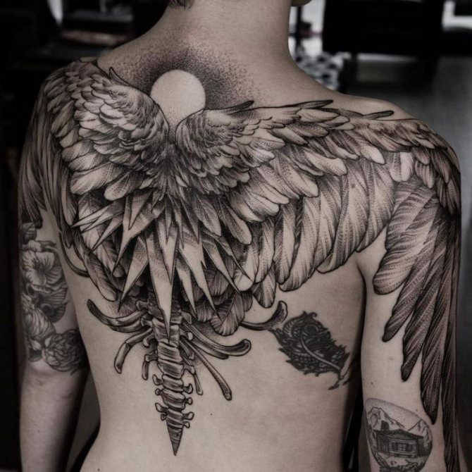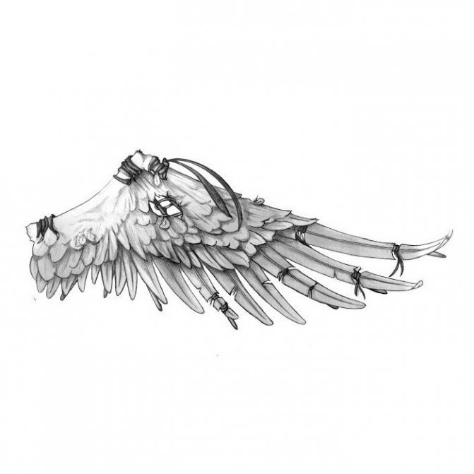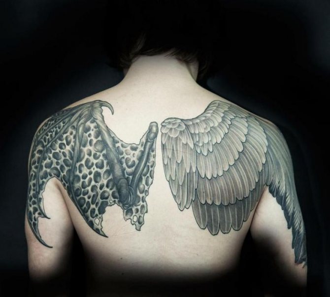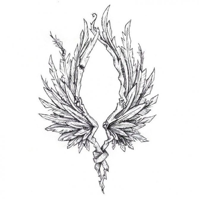 Väliversio - langenneen enkelin siivet. Ne koostuvat höyhenistä, mutta luonnos sisältää aggressiivisia yksityiskohtia, kuten tulta, palaneita osia jne. Tällaiset tatuoinnit osoittavat käyttäjän uhmakkuutta, haluttomuutta sietää sosiaalisia normeja ja turhamaisuutta. Henkilö on riippumaton muiden mielipiteistä.