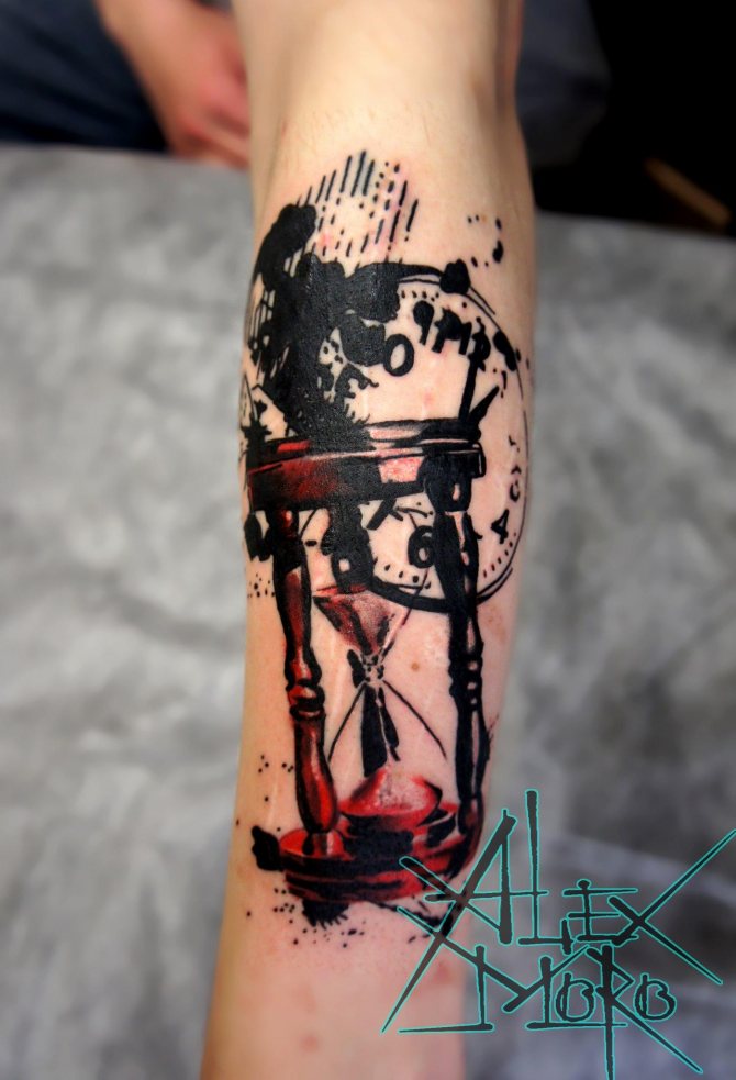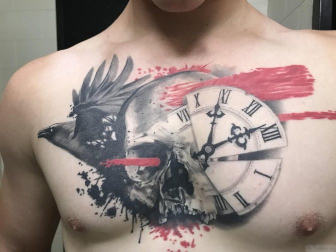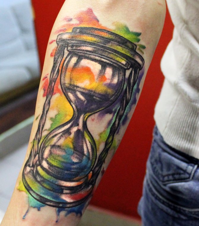 Kello-tatuointi on valokuva.Kello-tatuoinnit ovat usein yllättävän omituisia ja epätavallisia. Kvartsihiukkasten sijasta tiimalasikuvioissa voi olla verta. Tästä tulee merkki siitä, että aika on itse elämä. Tatuoinnin voi ymmärtää eri tavalla: - olemassaolo on veristä ja pelottavaa.