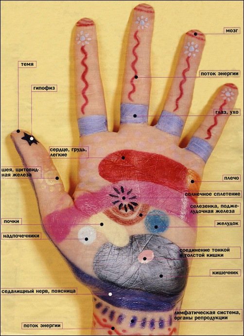 Uskomatonta mutta totta - yksi oikea kosketus ja näytät paremmalta, tunnet itsesi paremmaksi ja jopa ajattelet paremmin! Sinua vaivaa päänsärky, olet liian väsynyt tai olet uupunut kuukautisia edeltävästä oireyhtymästä... Käsi kurottautuu aspiriinia, kahvikupillista tai suklaapatukkaa kohti. Lopeta, katso tuota kättä vanhan kunnon ennustajan tarkkaavaisuudella ... ja auta itseäsi. Miten refleksologia toimii? On olemassa kokonainen tiede nimeltä refleksologia, joka tutkii kämmenen (sekä jalkaterän ja korvan) bioaktiivisia pisteitä, jotka ohjaavat koko kehoa. Esimerkiksi oikea käsi vastaa kehon oikeaa puolta ja vasen käsi vasenta puolta. Jos napautat oikeaa kohtaa, sillä on välitön vaikutus. Miksi? Kuten itämaiset tietäjät sanovat, kaikki fyysiset ongelmat johtuvat energiavirran "tukkeutumisesta". Painamalla aktiivisia pisteitä vapautamme tämän tukoksen. Länsimaiset asiantuntijat sanovat, että kun tiettyjä pisteitä stimuloidaan, hermosto lähettää signaaleja aivoihin. Yleensä tulos on sama - elimistömme parantaa itsensä. Ei hassumpaa, eikö? Ja mikä säästö kodin budjetille! Näin se tehdään: paina parantavia pisteitä peukalolla tai purista peukalolla ja etusormella. Etsi merkit kussakin tapauksessa ja etsi ne kuvasta. Parhaan tuloksen saat, kun toistat saman toisen käden kohdalla.