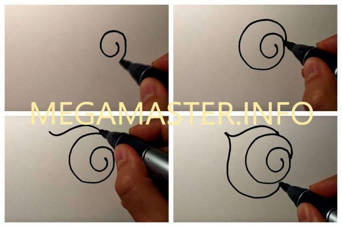 Keresse meg a középpontot, helyezze el a jelölőt. Rajzolj egy spirált. Minden fordulónak nagyobbnak kell lennie, mint az előzőnek. Háromszor kell megfordulnunk. Rögzítse a spirálvonalat a legközelebbi oldalra. - Lépjen néhány centiméterrel balra a spiráltól. Rajzolj egy hullám alakú vonalat. Csatlakoztassa a hullámot a spirál egyik oldalához. A hullám felső pontjáról indítson egy másik hullámot, de azt az ellenkező irányba vezesse. Szirmot formáltál.