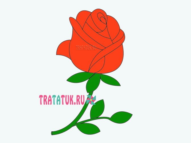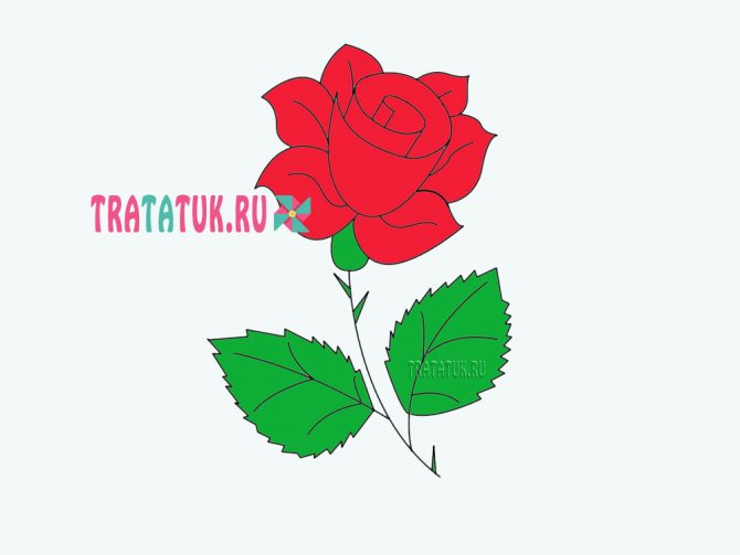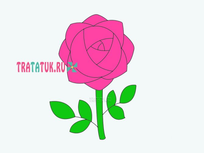 Amikor a rózsa készen van, elkezdhetjük a színezését. Ehhez ceruzákat fogunk használni. A bimbó rózsaszínű lesz, a levelek pedig zöldek. A szokásos módon is festhetsz, vagy gyakorolhatsz és árnyékokat adhatsz hozzá. A munka befejeződött.