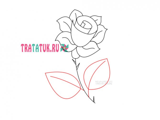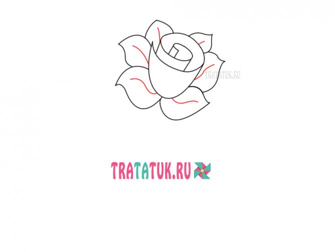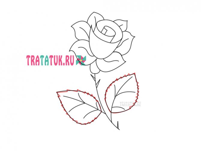 A rózsalevelek szélei kissé cakkosak, rajzolj cikkcakkos vonalakat a tetejére, a levelek külső kontúrja mentén.