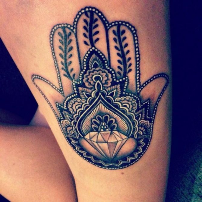 - A boldogság és a védelem megtalálása. Minden lány arról álmodik, hogy megtapasztalja a szeretet és a védelem érzését választottjától. Így egy látványos rajz egy khamsa formájában egy nő testén a tetoválás tulajdonosának romantikus és édes naivitásáról beszélhet.