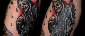 Azok a hímek, akik megkockáztatták, hogy fekete csuklyás csontvázrajzot festenek a testükre, gyakran bonyolult, akaratos természetűek, és szívesebben hódolnak a nem biztonságos időtöltésnek. Kockázatvállaló, minden veszélyt megvető, mindenkivel és mindenkivel dacoló magatartást tanúsítanak. Sokan hisznek abban, hogy a kaszástól való védelem legendája igaz, és a mintát a halál elhárításának szimbólumaként használják, amely visszavonul, ha szembesül a tükörképével. A férfiak számára ez egyfajta módja annak is, hogy hangsúlyozzák létezésük tudatosságát, és azt, hogy az élet végét természetes és elkerülhetetlen eseményként fogják fel. A férfi vázlatokat a méretarányok és a sötétebb színek különböztetik meg.