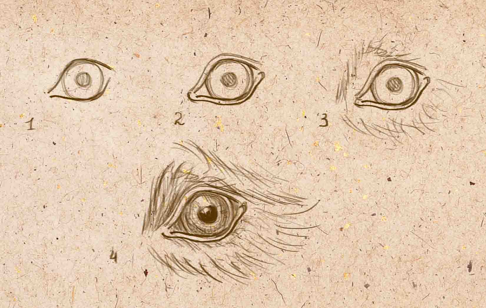 Ez a szekvencia nem szorul különösebb magyarázatra. Fontos, hogy a szemhéjakat helyesen jelölje meg, nincsenek gyapjúval borítva, és enyhe tükröződés lehet rajtuk. A gyapjú a szemtől távolodó irányban, különböző irányokban nő. A szem felett van egy enyhe ránc, valami olyasmi, mint a szemöldök vagy a szemöldök ívek.
