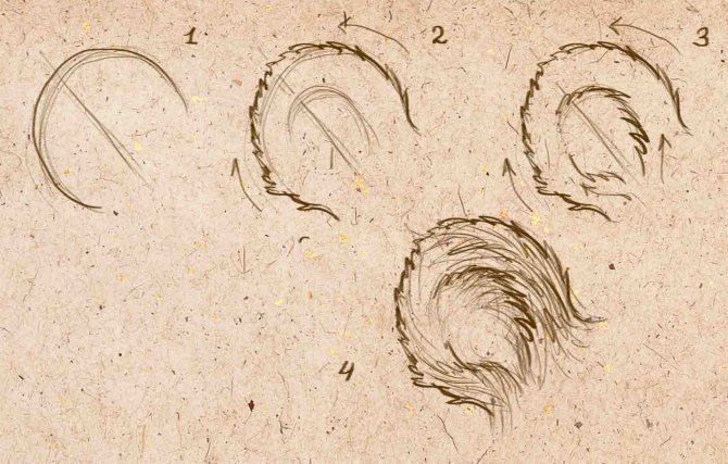 Könnyű fület rajzolni. Fontos, hogy a gyapjú irányát helyesen mutassuk meg, ez látható az ábrán, a 2. és 3. lépésnél.