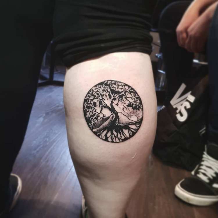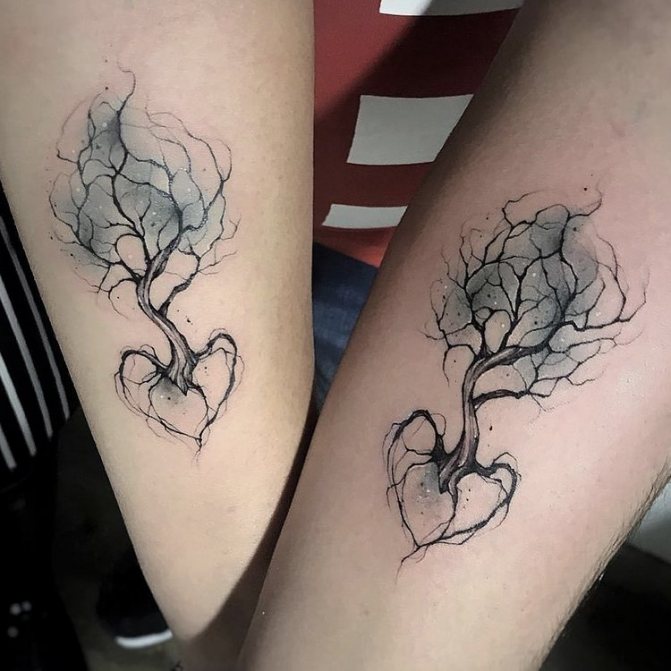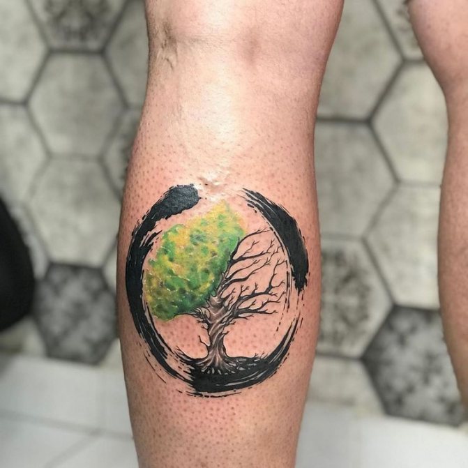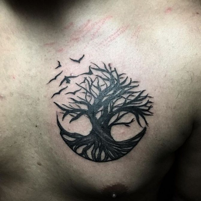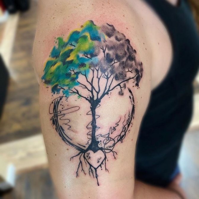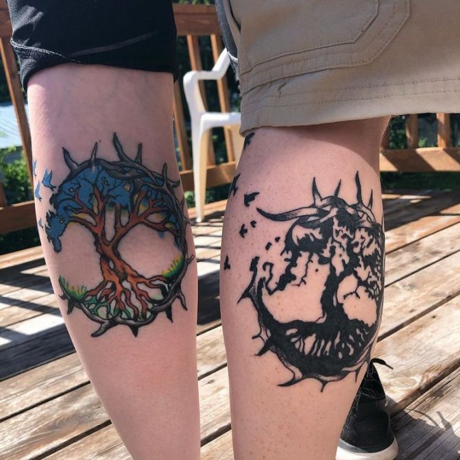 Egy fa kombinációja madarakkal vagy állatokkal, nap és sugarak, gyökerek különböző elemekben, mint koponya, csont vagy szív. Egy ilyen tetoválás egy teljes képet hoz létre a testen.