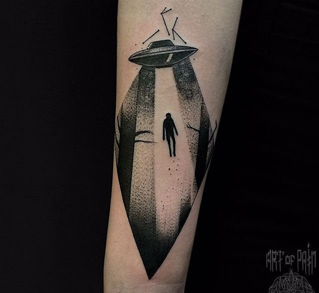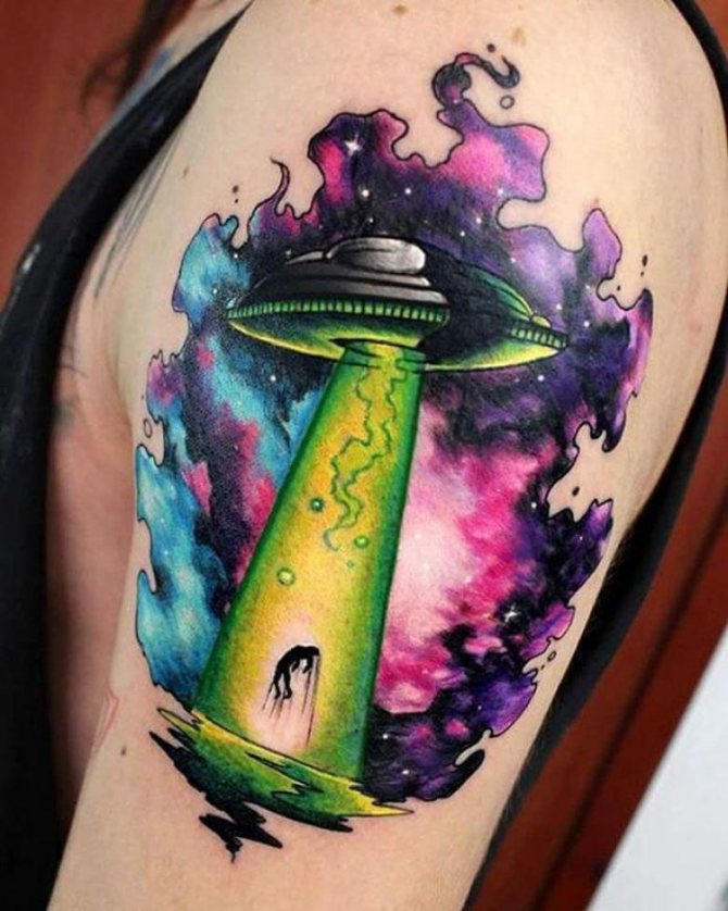Az UFO-tetoválások - repülő csészealjakkal, földönkívüliekkel, rakétákkal - nagyon népszerűek. A tetoválások az ismeretlent, a titokzatosságot jelképezik. Érdeklődést mutatnak az ismeretlen és a kozmikus rejtélyek iránt.