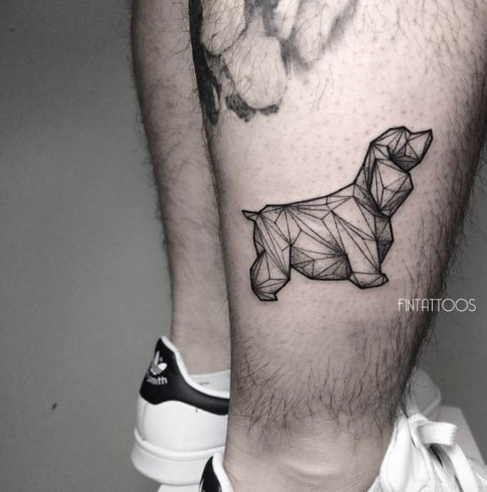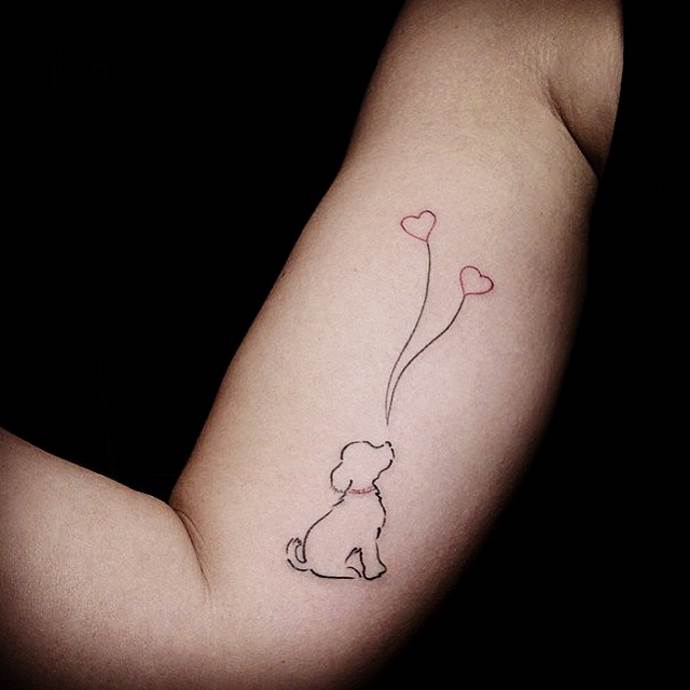 A minimalizmus jól jön a kis tetoválásoknál. A kutya sziluettje csak körvonallal körvonalazódik, belső kitöltés nélkül. Ez a technika alkalmas a tetoválószalonban tett első látogatásra. A legjobb helyek az alkalmazáshoz - a csukló, a has, a nyak hátsó része, a lapocka.
