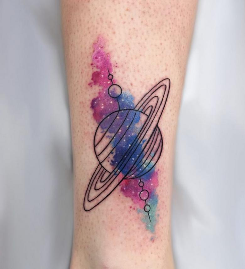 Leggyakrabban sötét színekben. Különböző árnyalatokat használnak, és jellemző az akvarell technika. A bolygó gyűrűi hagyományosan világos körvonalakkal rendelkeznek. Néha a képet csillagokkal vagy más kozmikus elemekkel kombinálják. Ritkán a tetoválásokat feliratok kísérik, gyakran latinul, gyönyörű mondásokkal az élet gyarlóságáról.