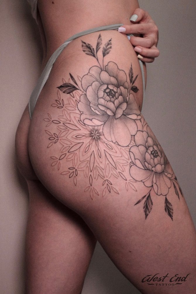 Ritka egyedi tetoválások. Alapvetően ezek a díszek, csillagok és kör alakú díszek, mivel a bőrnek ez a területe rendelkezik azzal a tulajdonsággal, hogy nyúlik és zsugorodik. A legtöbb esetben még a hüvely összetételében is kerülendő, mert gyakran érintkezik a karfával, az asztallal és a ruházattal.