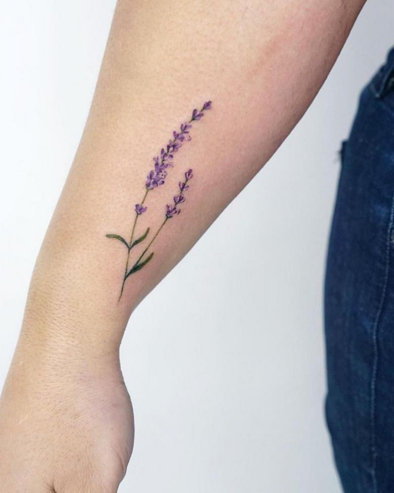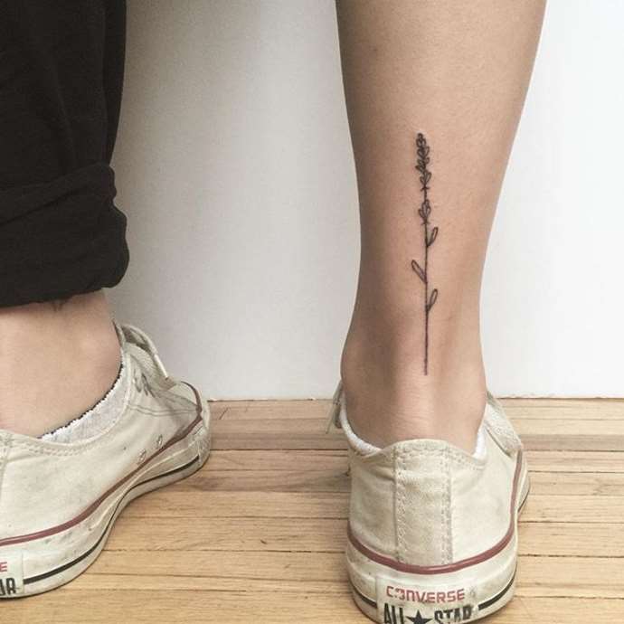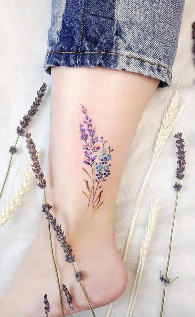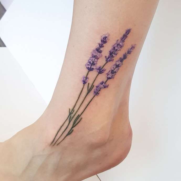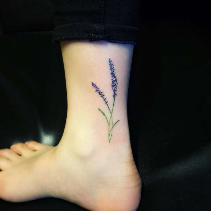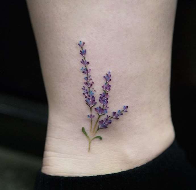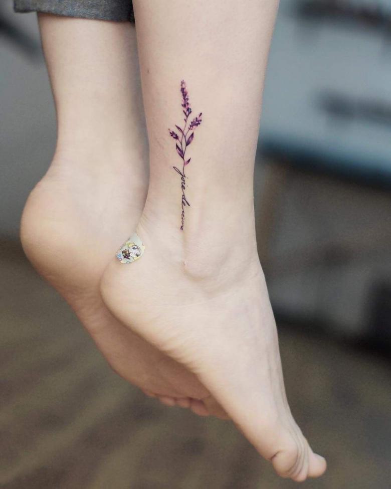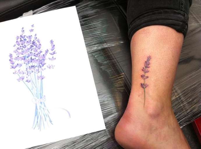 Tetoválás levendula. Tetoválás a lábán. Levendulaszínű tetoválás.