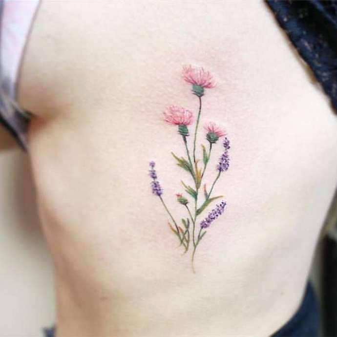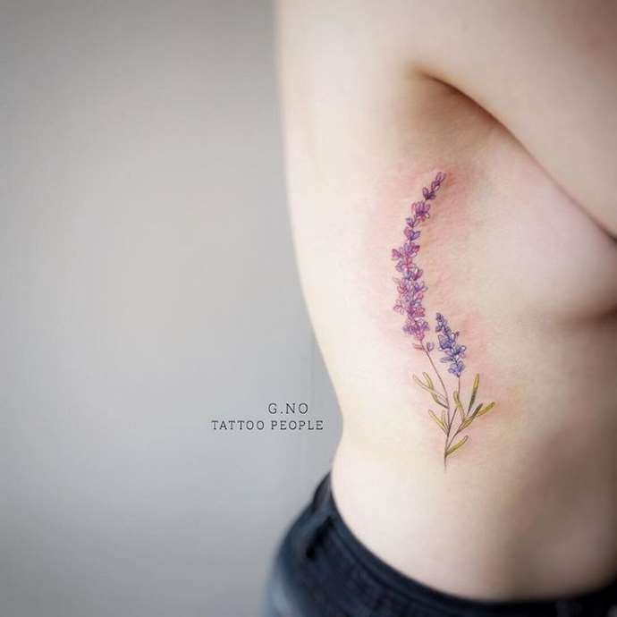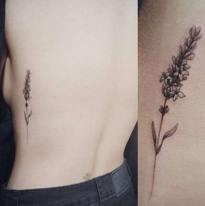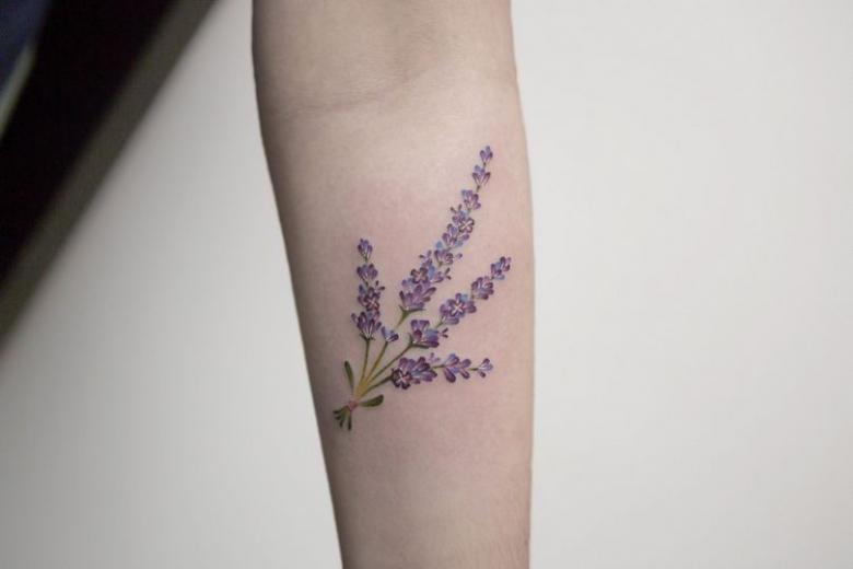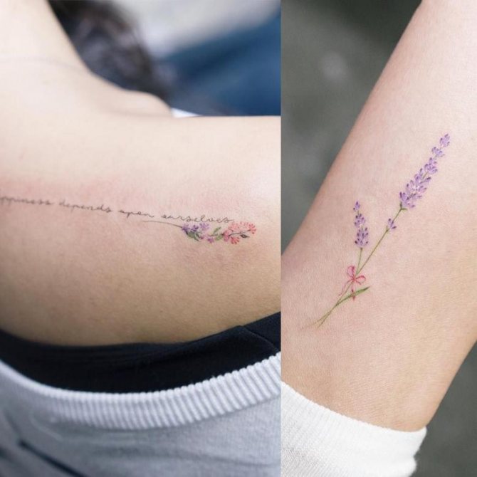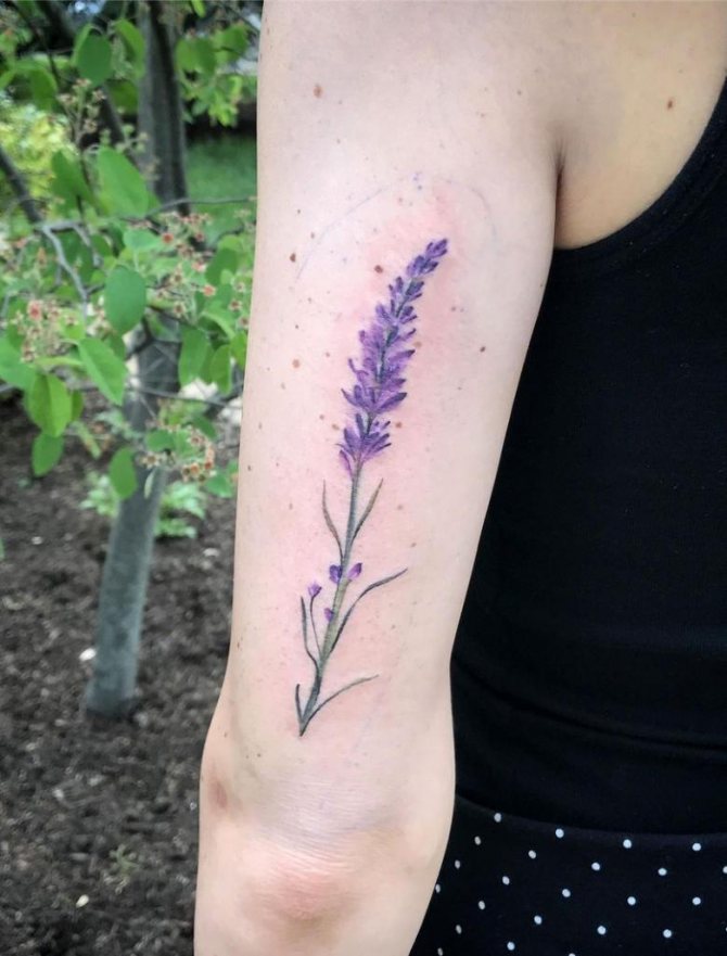 (Ezt a képet kedvelik a hölgyek, és a levendula a levendula kedvelt szava. - Más virágokkal és növényekkel kombinálva (népszerűek a pipacsok, amelyek jelentése szomorúság és gyász, például a boldogtalan szerelem emlékére készített tetoválás).