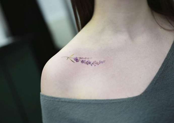 Egy levendulaszirmos tetoválás a kulcscsontján.
