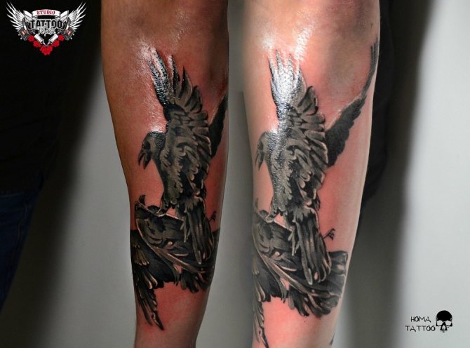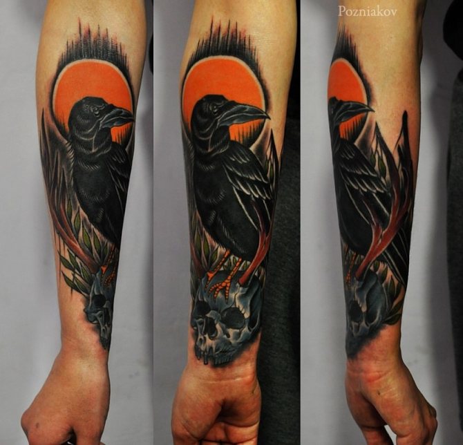 A holló a halál szimbóluma. A koponya ezt a jelentést hangsúlyozza. E szimbólumok kombinációja az élet törékenységére emlékeztethet. Leggyakrabban az ilyen tetoválások tulajdonosai maximalisták, szeretik a kockázatot és inkább az élénk érzelmeket szeretik megtapasztalni.