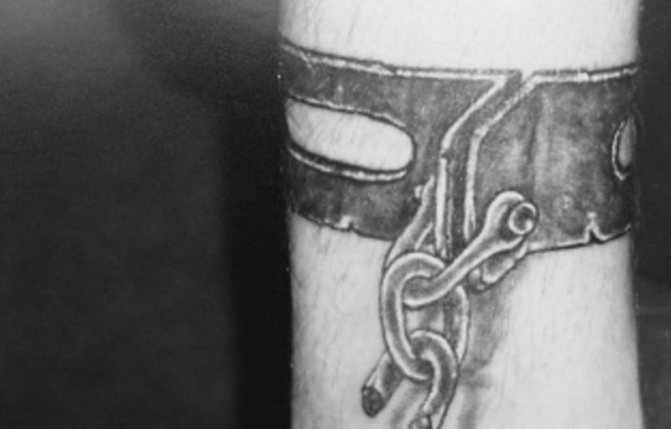 A bilincsek ugyanazt jelentik, mint a bilincsek, ami azt jelenti, hogy viselőjüket több mint 5 éve bebörtönözték, és súlyos büntetésüket töltik. De ez a bűnözői tetoválás szimbolizálhatja az ember azon vágyát is, hogy ledobja magáról az igát, és minél hamarabb kiszabaduljon. Ez egyfajta talizmán a további bebörtönzés ellen.