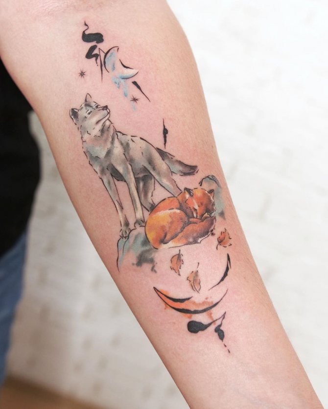 Ha farkas tetoválást szeretne a vállára, amely simán lemegy a karján, fontolja meg ezt a lehetőséget. Nagyszerű lehetőség az akvarell. Ez egy igazi művészeti stílus, amely lehetővé teszi, hogy igazán színes, vibráló festményeket hozzon létre, elképesztő színskálával. Ha egy ilyen tetoválást nézel, nem fogsz arra gondolni, hogy mit jelent a tetováló farkas, mert ebben az esetben a kép egy natív művészeti alkotás lesz. De a kompozíciók teljesen eltérőek lehetnek. Fentebb, amikor a fiúknak szánt farkas tetoválásokat néztük meg, röviden rámutattunk a más mintákkal való lehetséges kombinációkra. Itt is megjegyezzük, hogy az ideális kiegészítő elemek a következők lehetnek: