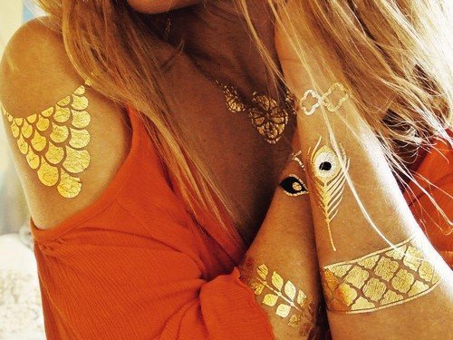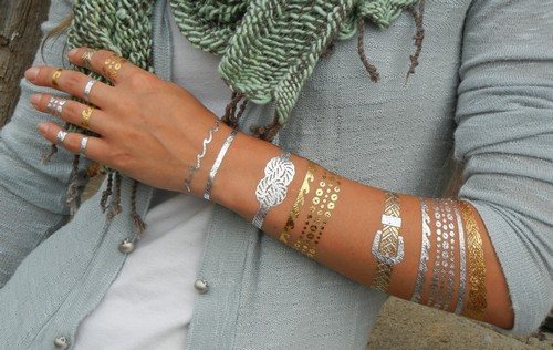 - A fémes árnyalatokban kivitelezett tetoválások emlékeztetnek az ékszerekre, ezért még abban az esetben is kecsesebbé tehetik a képet, ha maga az ékszer viselése nem kívánatos (például egy strandon);