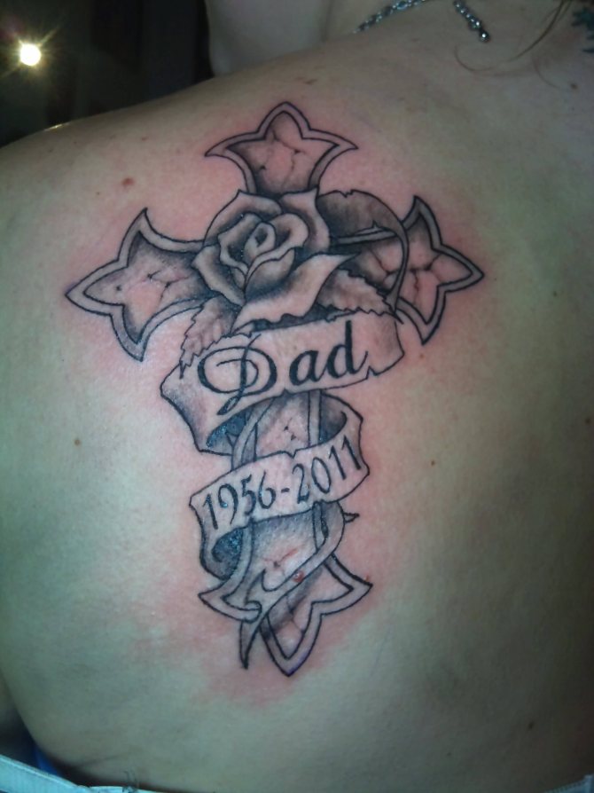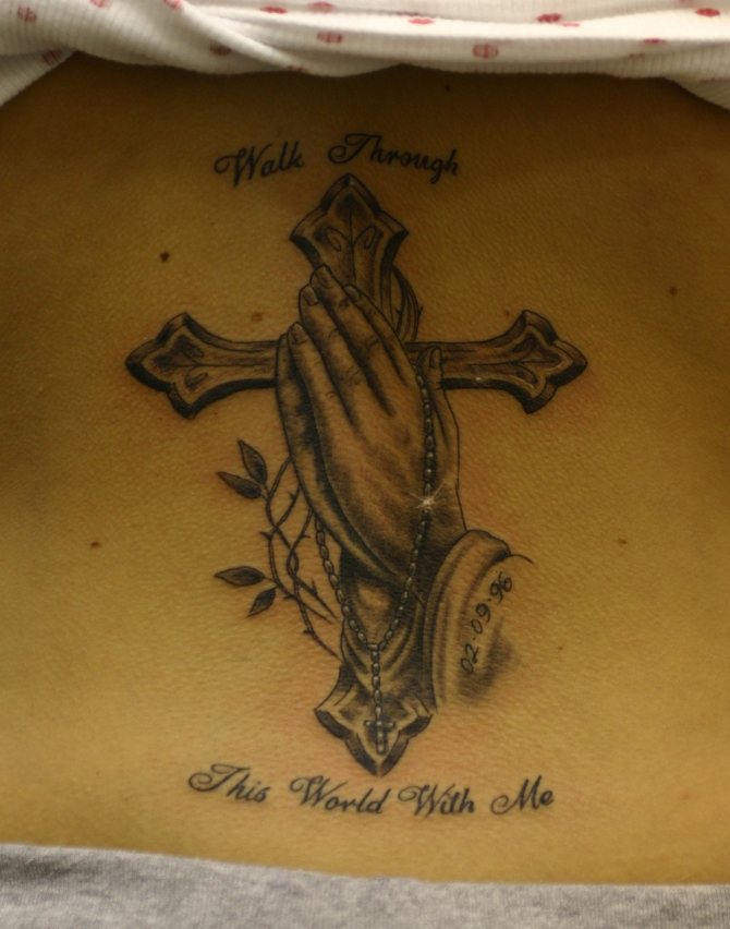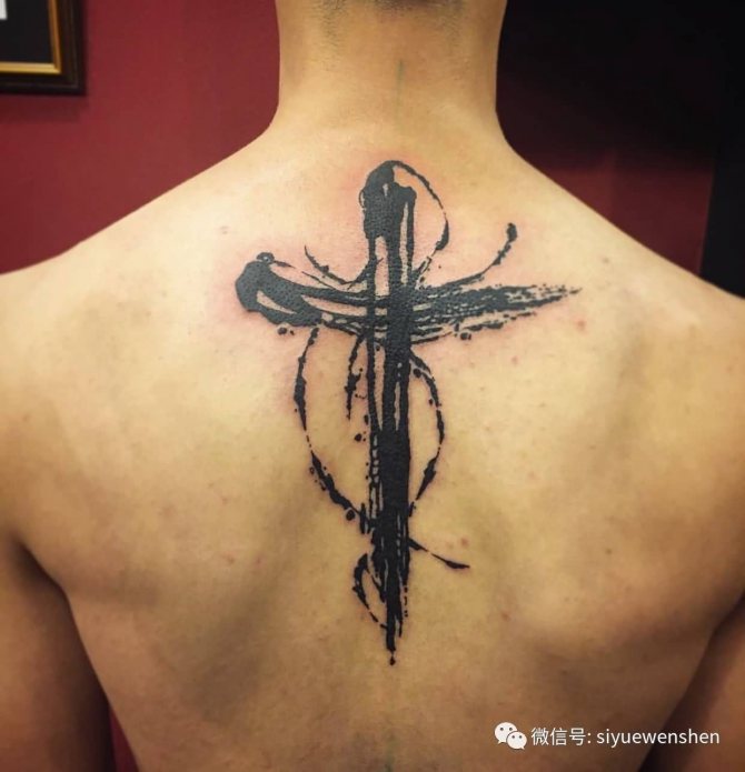 - Hagyományos stílusú kereszt a lapockák közötti területen. Egy ilyen dizájn díszíthető a személyes mottóját vagy egy bölcs idézetet tartalmazó felirattal.