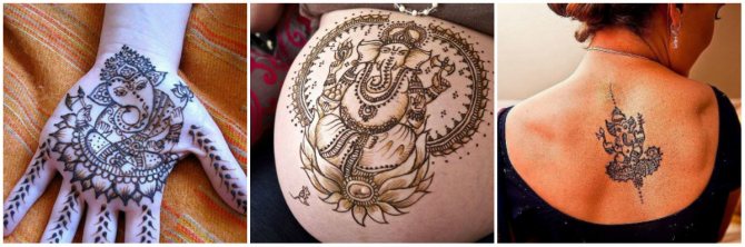 Az elefántok képei a mehendiben szintén ellentmondásosak. Az erőt, a bölcsességet, a bölcsességet, a hosszú életet, a dicsőséget, a győzelmet és a harciasságot szimbolizálja. Indiában az elefántot nagyon különleges módon kezelik. Ott Buddha kedvességének és irgalmasságának jelképei. Nem véletlen, hogy Ganesha, a bölcsesség és az ártatlanság istene egy elefánt fejét viseli.