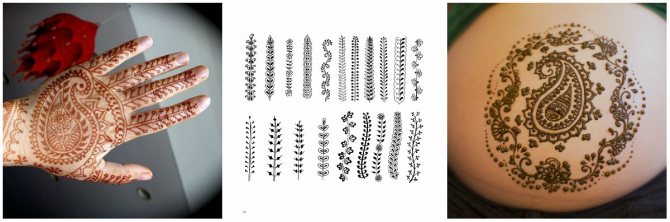 Az indiai és pakisztáni minták bonyolultak és nagyok, a tenyértől az alkarig és a lábtól a térdig, a kesztyű vagy harisnya illúzióját keltve. Csipkemintába szőtt vonalakból, díszítésekből és cseppmintákból állnak.