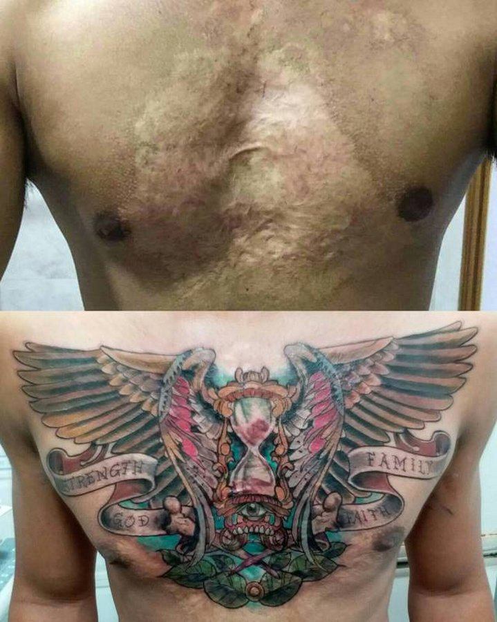 Néha előfordulhat, hogy a tetoválás valamilyen okból, például orvosi okból, pszichológiai akadályból vagy bármilyen más okból nem lehetséges, akkor a másik utat is járhatod, és egy "láthatatlan" tetoválással átfedheted a téged zavaró hibát. Bizalom ebben az esetben csak egy tapasztalt és bevált mesterre van szükséged, aki felveszi a bőr színéhez ideális pigmentet, mert többnyire az átfedő hegek a test szabadon álló részein - a nyakon, az arcon és a kézen - vannak kitéve. A bőr elszíneződése a tetoválás után a barnulás következtében előfordulhat, és az eljárás nem túl hatékony a nagyméretű hegeken vagy kiemelkedő hegeken. Ilyen esetekben a szalonban dolgozó mesterek másfajta tetoválást javasolhatnak.