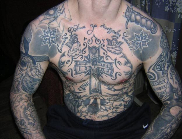 A férfi bal kezén lévő felirat így szól: "Bűnösen élek - nevetségesen halok". Képek a démonok и szörnyek célja, hogy megfélemlítse a többi foglyot, és hitelessé tegye a viselőjét a körén belül. Német írás a férfi nyaka alatt középen és a szöveg: "Isten velünk van"; a bal oldalon: "Siess és élj". A vitorlás az alkaron a szabadság iránti szenvedélyt jelzi, és azt, hogy viselője potenciális szökevény. A jobb oldali elítélt vállán tetoválás: "Keep the love"; alkarján: "Crab": I vow to slaughter activists and whoremongers (Megfogadom, hogy aktivistákat és kurvákat fogok lemészárolni). Rose a vállán azt jelenti, hogy viselőjének tizennyolc év börtön jár.