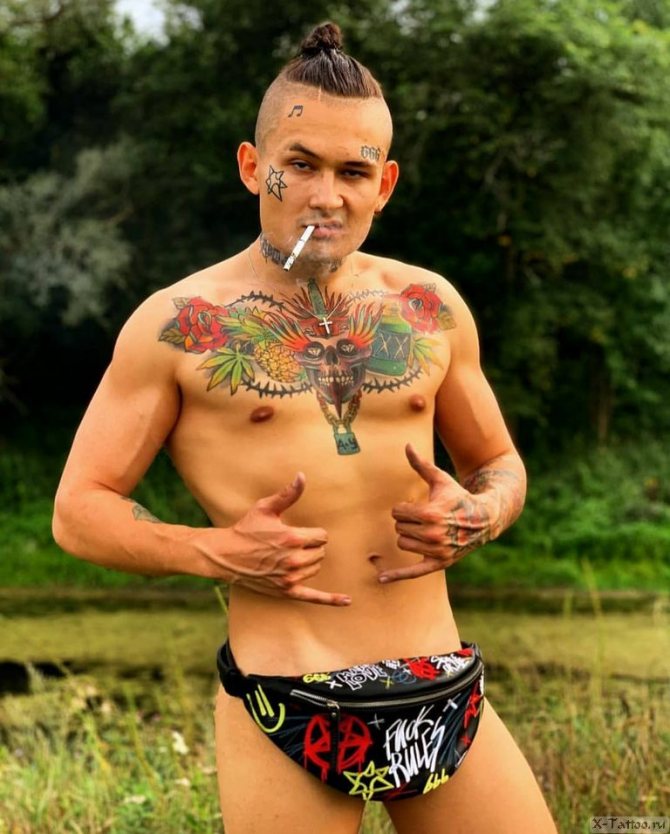 Néha hasonló testképet mutatnak az erősebb nem képviselői is. A férfiak gyakran választják a tetoválásokat a stílusában Grafikus és törzsi. A férfiak számára a 666-os számot ábrázoló testkép azt jelenti: